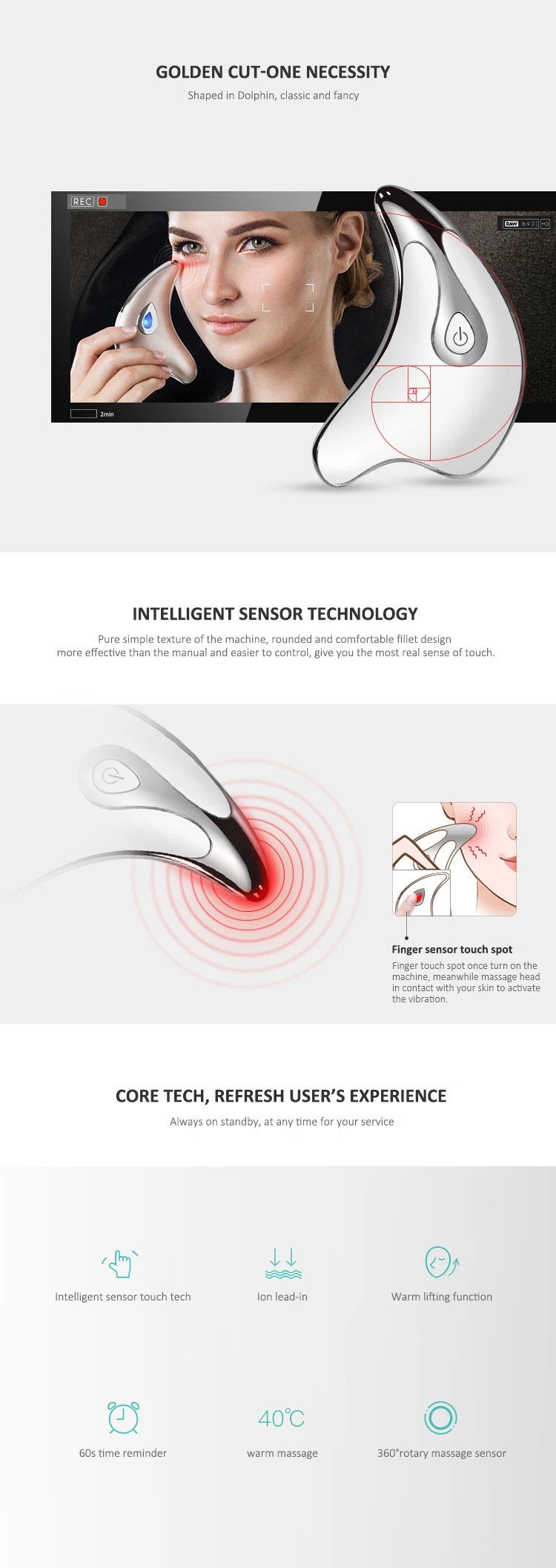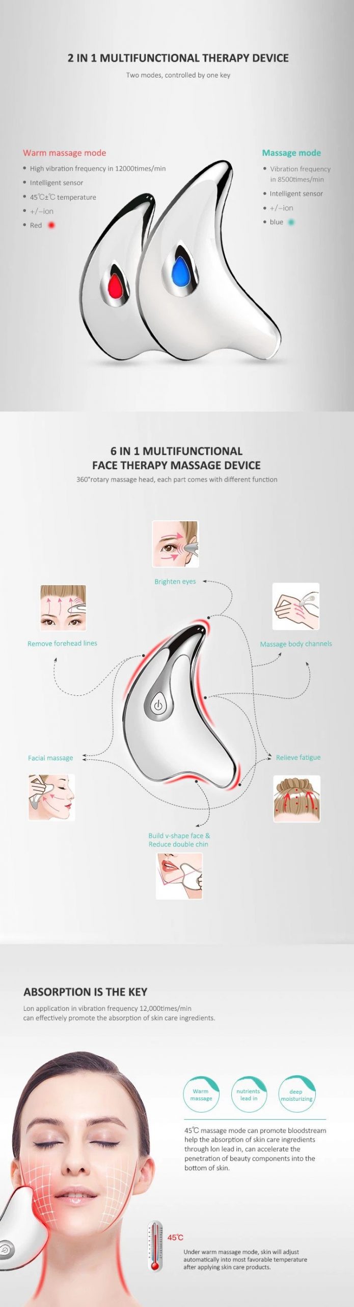 Mainly face-lift massage skin sculpting, promote facial blood circulation and metabolism, thereby delaying and improving the skin caused due to age relaxation, wrinkles, pigmentation, eye bags and multiple jaw and other natural aging phenomenon.